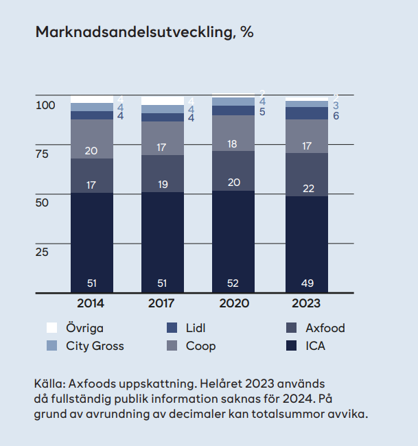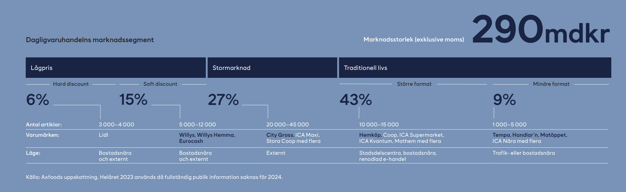 Dagligvaruhandeln är relativt okänslig för konjunktursvängningar och tillväxten drivs till stor del av befolkningsökning och inflation. Historiskt har den årliga marknadstillväxten uppgått till 2–3 procent. Marknaden är mogen och de tre största aktörerna – Ica, Axfood och Coop – står tillsammans för cirka 90 procent av försäljningen. Axfood har med särskiljande koncept en närvaro i samtliga segment på marknaden och under slutet av 2024 uppskattas marknadsandelen inkluderat City Gross, som förvärvades sent på året, till ungefär 25 procent (22).